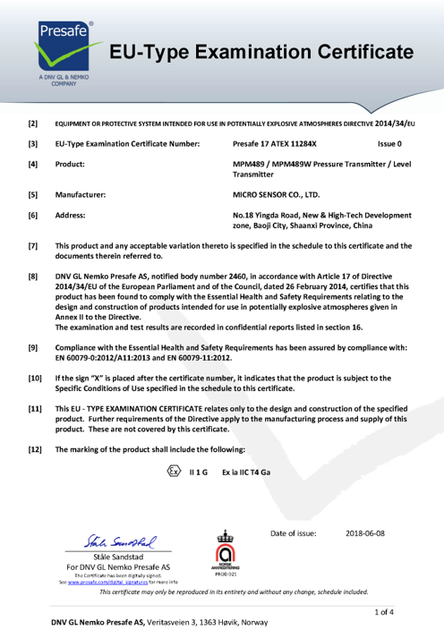 我司MPM489型壓阻式壓力變送器、MPM489W型液位變送器,通過DNV GL Nemko Presafe授權(quán)的ATEX防爆認(rèn)證。